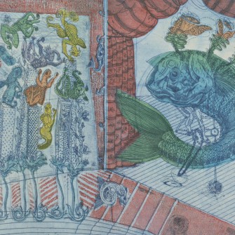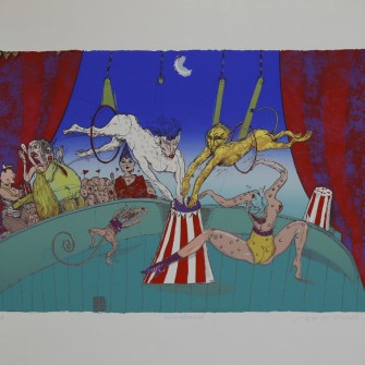 During the studio period, he began to make a living by painting and selling these paintings, often in Normand's home, which was Picasso's former studio and where David Hockney often came to paint. He opened a drawing exhibition at Galerie Philippe Fregnac. Seven paintings were sold in the exhibition, which was a great success. One of the sold paintings was bought by Jacques Normand and sent to Istanbul as a gift to his aunt Özcan Gündüz, who supported Koyunoğlu in every way. Because, in this painting, the artist included people who were influential in his life and childhood, and objects that reminded them of these people. Also this drawing, apart from the one printed on the gallery invitation, it is the only original source from which information can be obtained about the style and technique of the drawings exhibited because all of the other drawings in the exhibition were sold over time, only low-quality copies of some were kept. He moved to a house in Le Bourget, outside of Paris. He made a definite return to Turkey in 1984. In 1986, he won the first prize in the illustration category of the National Graphic Arts Exhibition held in Istanbul. Shortly after completing his etching education at the Rene Carcan Etching Foundation between 1990-91, he participated in the group exhibition opened in the same foundation. He worked on printmaking at The Çamlıca House of Art in Çamlıca in 1990.